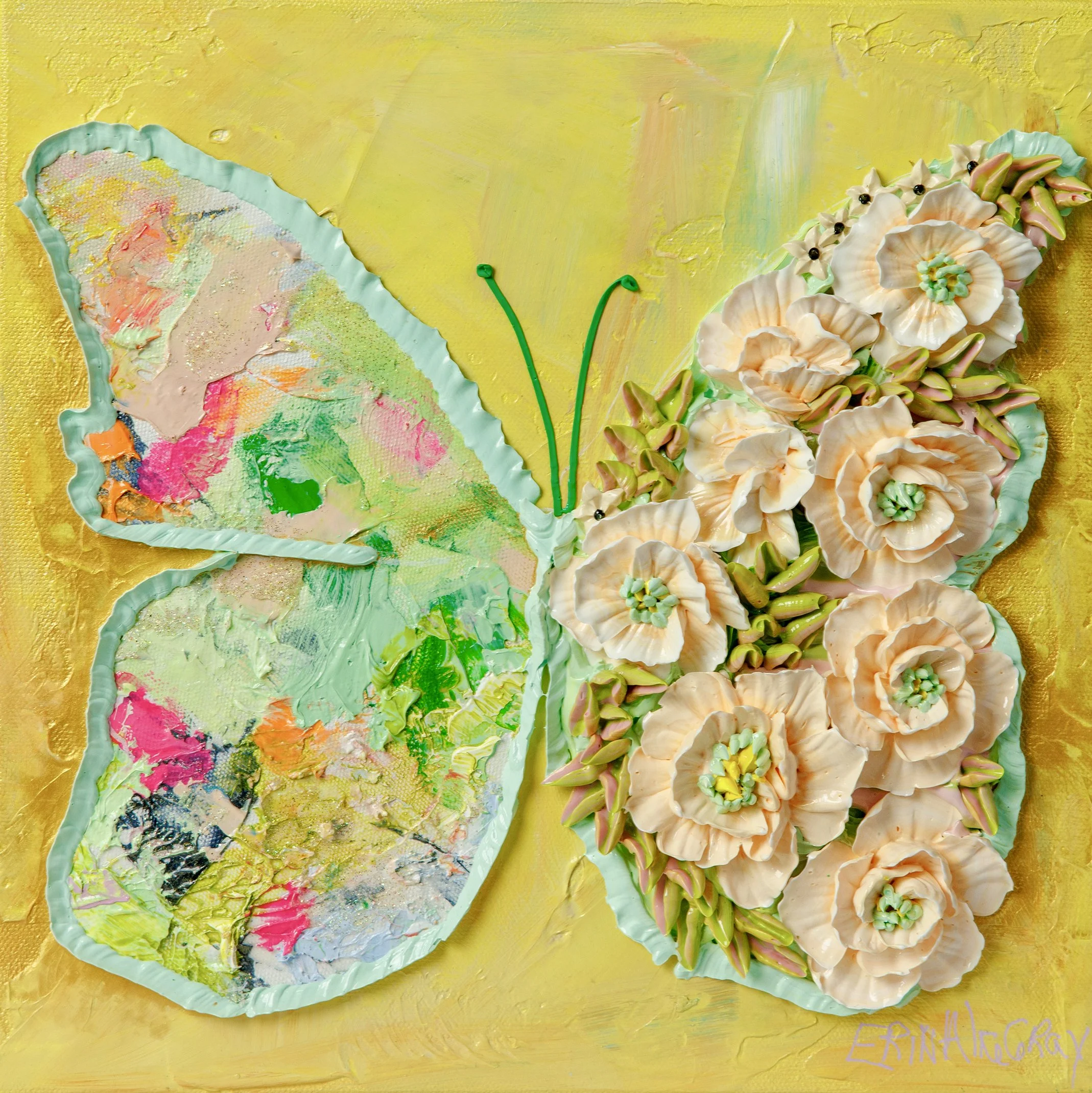 Color has always been a huge draw for Gray, “It speaks directly to my soul. A glimpse of a new or unexpected color combination will catch my eye and inspire and delight me. My paintings explore this interplay between combinations of color and my reactions to them. Everything might begin with color, but it is through the use of texture that I seek to communicate the emotions it evokes. To me, it’s about finding the joy in these unexpected combinations.” Her 3-dimensional pieces created with “random found objects” reflect her idea that leftover items, that otherwise would have been thrown away, can be given a new life and be used to create something beautiful.