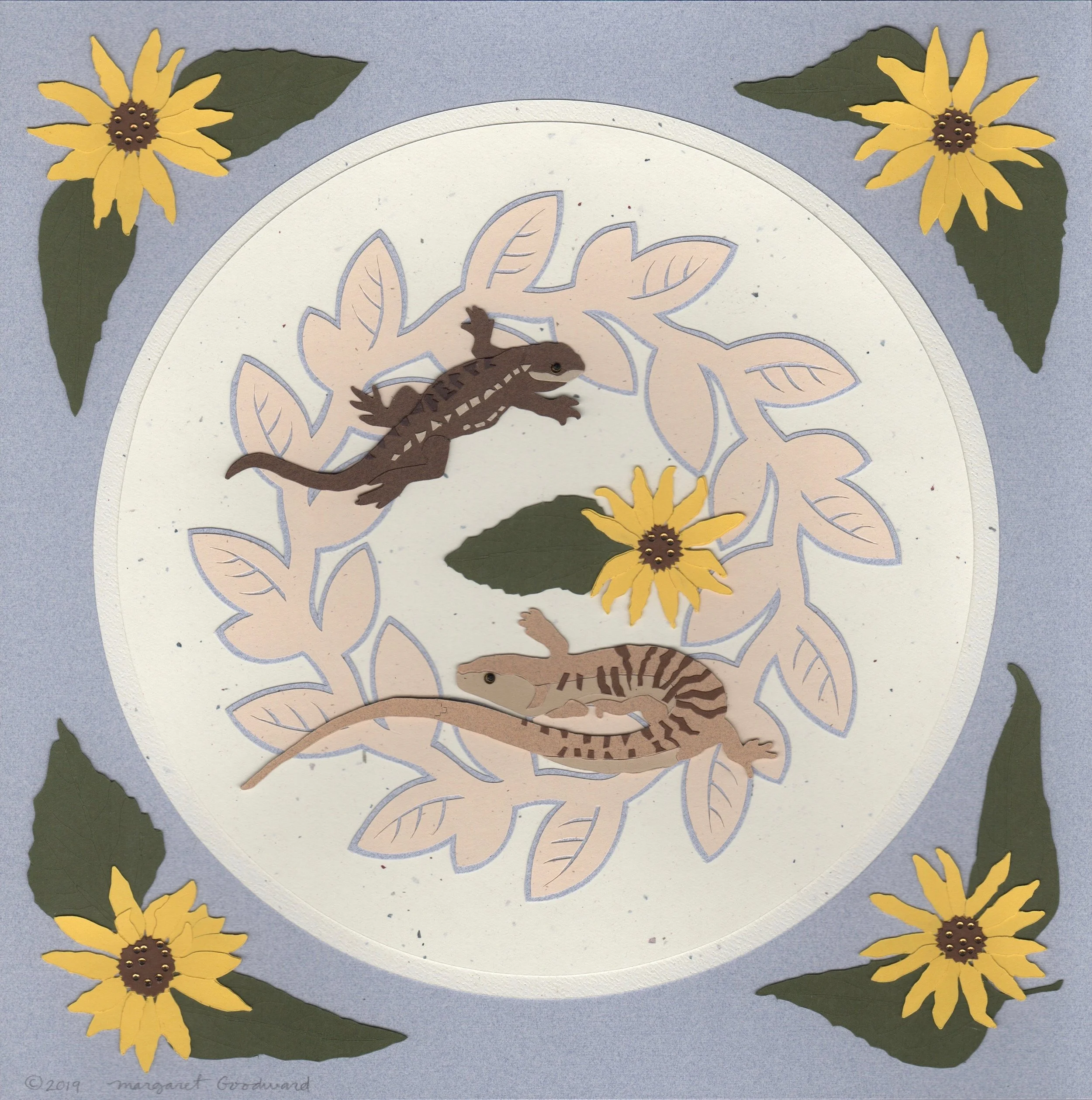 Exploring her creativity since childhood, Goodward’s intricate art is created using multilayered cut‑paper low reliefs using a scalpel, vivid color, and intricate detail—drawing from a uniquely expansive artistic background in ceramics, figure drawing, metalworking, and printmaking (especially collagraph - printing from a plate of collaged materials). A period of recovery after an auto accident led to collage‑drawings and cut‑paper mandalas. Paper ultimately became her primary medium. “My images reflect on natural growth and human growth with artistic interests in positive-negative space, radial forms and subtle embossed or scribed details that reward those who come to look up close.”